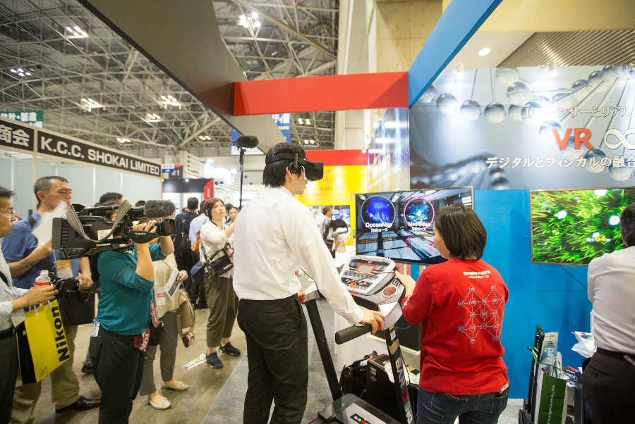 ・今回の展示内容は前回に続きいVRとIOTセンサーを組み合わせたサービス【VR∞IOT】フィットネスVRの展示、新しいエアロバイクコンテンツも追加されています。内容はエアロバイクでリアルな自然景色の中を飛ぶ体験ができます!その他、前回大好評だったステッパー器具を使用した山登り「トレッキングVR」